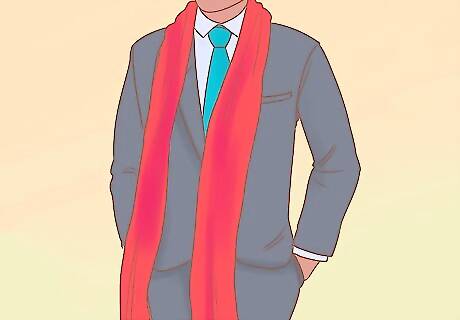 Pair colored ties with bright or neutral colors. When you're wearing bright or neutral colors, you can get away with a bit more experimentation. For example, a darker red tie pairs nice with a white shirt and black suit. You can also try some bolder striped patterns—just don't go too overboard in formal settings, such as weddings. Don't wear the same scale pattern on your tie as your shirt. For example, if your tie has a large scale pattern, be sure your shirt is either solid or has a small scale pattern.