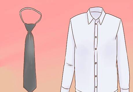 Wear a black tie with darker colored shirts. For darker shades of any color, a black tie is your best bet—brighter colors tend to pop out too much and make the outfit look messy. If you really want to add some color, choose a tie with a black or dark base and some large-scale patterns for a nice formal look. As a rule, your tie should be darker than your shirt. For example, if you're wearing a light gray dress shirt, wear a black or charcoal gray tie. The classic black suit and white dress shirt combination is an exception to this rule, as it works perfectly with a black tie. Just be sure to wear a white pocket square or you'll look like a waiter!