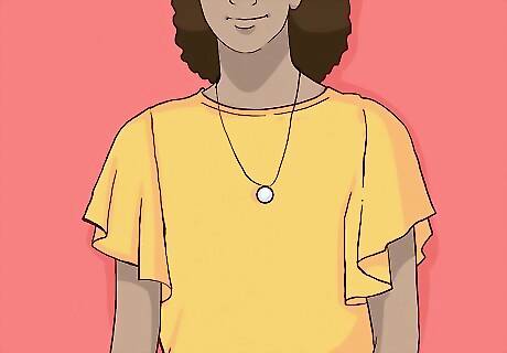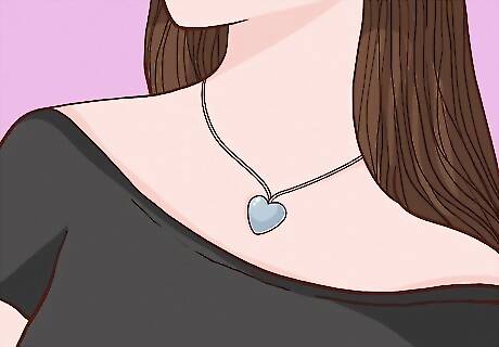 Let your locket stand out. Wear black or solid color top to give the most focus to your locket. Avoid layering on other necklaces or pendants. Keep your locket clean so it can shine its best. A top with a high collar helps showcase the locket entirely over the fabric you’re wearing. Alternately, if your locket falls at the collarbone, you can choose to wear a top with a neckline that cuts just below the locket. Try wearing a lace blouse to compliment the vintage feel.