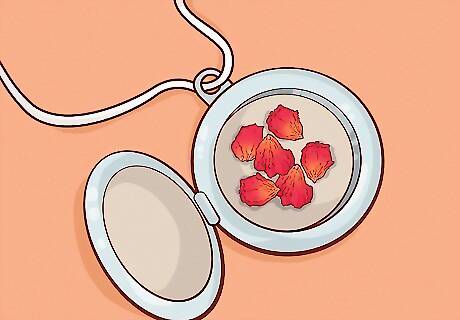 Hold an item in your locket. Choose a small memento, such as a lock of hair, bit of ribbon, or a dried flower petal. Or take a small square of fabric, dip it in perfume or scented oil, and close it in your locket. Think outside the box! If your locket opens and closes, you can put a little souvenir in it that has meaning only to you. For instance, a small piece of a ticket stub.
