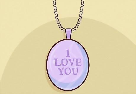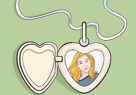 Get your locket engraved. Take your locket to a jeweler or engraver to get custom text written on your locket. Choose words or letters that are meaningful to you. These can be initials, a name, a date, or a phrase. For example, you may want to engrave a few song lyrics, a Bible verse, or a short literary quote. If your locket isn’t an engravable metal or you want a more temporary option, print the words on paper and display them inside your locket instead.