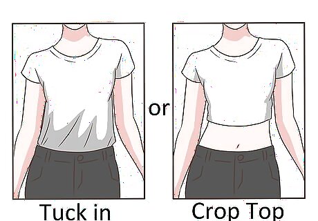 Tuck in your shirt or opt for a crop top. With all the volume on the bottom, you want to create a little negative space up top. Choose a crop top or tuck in your shirt to show off your waist line and accentuate your curves, which will create a more modern silhouette.