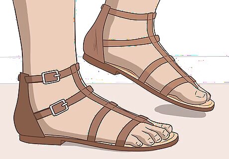 Add drama with a gladiator sandal. In summer, a gladiator sandal is a great way to make a statement with bell bottoms. Try a metallic copper sandal or even brown leather.