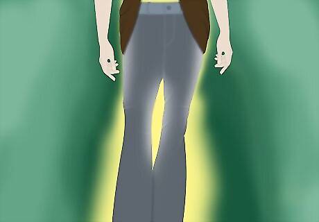 Put on your cardigan and either leave it unbuttoned or button a single button in the middle of the cardigan. Make sure the point where your shirt tucks into your bottoms is not hidden by the cardigan.