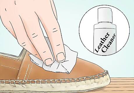 Use leather cleaner to spiff up leather espadrilles. Certain espadrilles are made with leather rather than canvas. In this case, you’ll need to use commercial leather cleaner to remove any dirt. Rub the cleaner into your shoes with a cotton cloth, working in a circular motion. Then, allow your shoes to dry before putting them on. Make sure to check the instructions for your particular brand of leather cleaner. It will tell you how much product to use to clean your shoes.