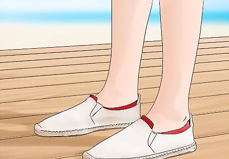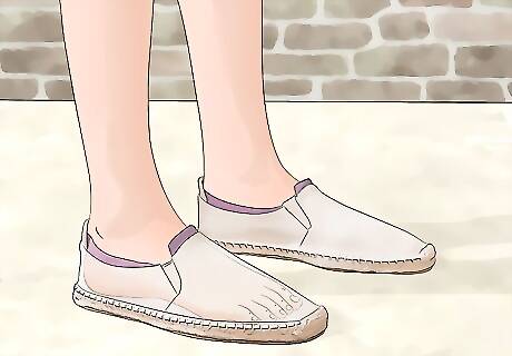 Wear espadrille flats as a summer-friendly alternative to sneakers. Espadrilles can be a great alternative to sneakers or flat boots during the warm summer months. Not only do they provide full coverage of your feet and are comfortable to walk in, but they’re also breathable and can handle a bit of sand or surf. Avoid wearing regular socks with espadrilles. Either ditch the socks altogether, or find a pair of no-show socks.