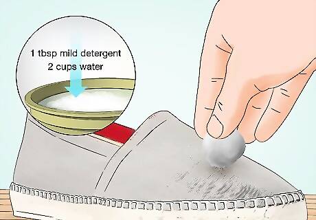 Clean your espadrilles with detergent and water. If your shoes get dirty, you’ll need to wipe them off with a mixture of detergent and water. Mix 1 tablespoon (15 mL) of mild detergent with 2 cups (470 mL) of water in a bowl, then dip a cotton cloth into the soapy water and scrub dirt off the canvas using a circular motion. Rinse the shoes with a clean cloth dipped in warm water, and allow them to air dry. To clean the jute soles, dip a toothbrush in the soapy water and gently scrub off any dirt. You can rinse off the soap with a cotton cloth dipped in lukewarm water. Never put your espadrilles in the washing machine, which will ruin the jute soles.