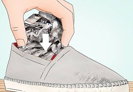Stuff your espadrilles with newsprint if the jute sole gets wet. The jute soles of your shoes can be ruined by water damage, so try not to get them wet. If you do happen to get caught in the rain or splashed with water, ball up pages of a newspaper and stuff them inside each shoe. Then, let your shoes air dry and remove the newspaper. You can replace the balled-up newsprint with dry pages after an hour or two, which will help speed along the drying process.