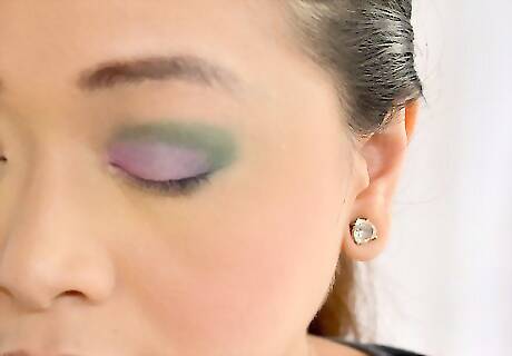 Apply purple along with green for a bolder, statement look. You can apply to the outer corner, inner corner, or center of eyelid. If you have hooded eyes, put it in the center of your eye. When you blink you can flash a little bold color. The inner corner or outer corner works too. Honestly, you can basically do anything.