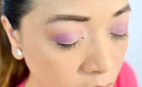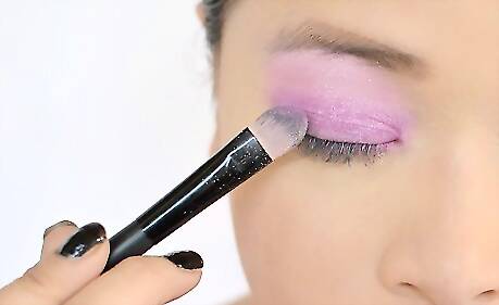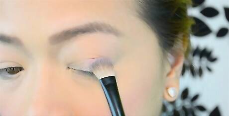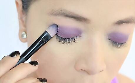 Apply a light purple into the crease as a transition color using a small domed brush, blending in small circular motions. Use windscreen wiper motions to really get into the crease. Using a light color will help blending when using darker colors.