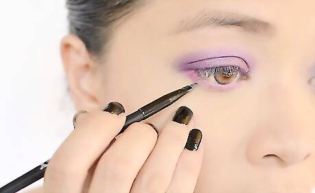 Add a light, shimmery highlight to inner corner if desired. It can be a purple color, or you may prefer a shimmery beige highlight color. This really helps to open up the eyes and make them look bigger.