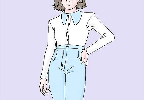 Tuck a padded blouse into some high-waisted jeans. Find an old vintage blouse with prominent shoulder pads. Slip on a pair of jeans that match your top, then tuck the blouse into the waistband. For an extra stylish look, roll your sleeves up to your elbows. For example, you can wear a button-up coral blouse with a pair of light blue, high-waisted jeans. As an extra accent, slip on some hoop earrings or a nice watch.