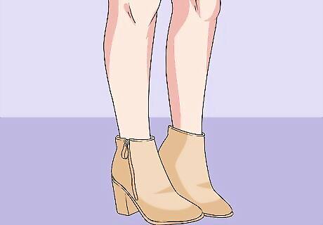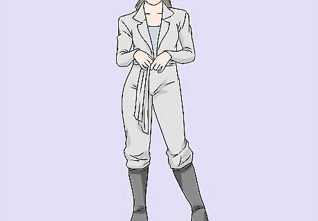 Wear some boots for an on-the-go look. Try a pair of ankle boots before heading out and about. If you aren’t in the mood for something flashy, ankle boots can help you get from point A to point B in a comfortable, stylish way. If you’re feeling especially ambitious, opt for more colorful boots. For a subtle look, you can slip on some neutral-toned boots. If you’re feeling especially daring, try on some brightly colored thigh-high boots instead. Costume Party Idea Recreate a classic ‘80s look with a padded top and leotard. Pick a black leotard as the base of your outfit, then slip on a blouse or top with prominent shoulder pads.