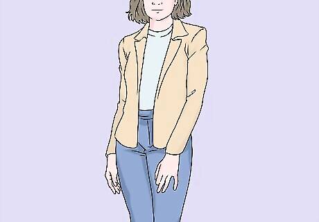 Pair a shoulder padded blazer with jeans for a sleek look. Search through your closet for a nice blazer that still fits you comfortably. It doesn’t matter what color the jacket is—instead, play around with your favorite pair of jeans to create a chic, streetwise outfit. For instance, you can pair a tan or cream-colored blazer with a pair of blue jeans. Finish off the outfit with a comfortable pair of shoes, like sneakers or flats.
