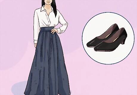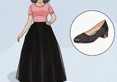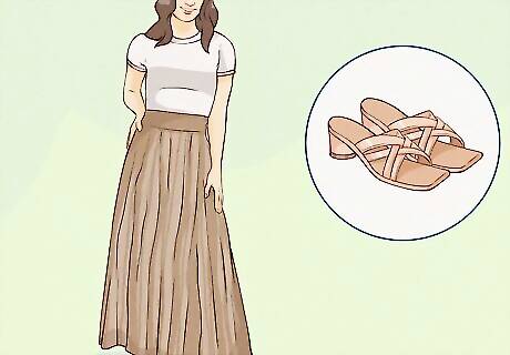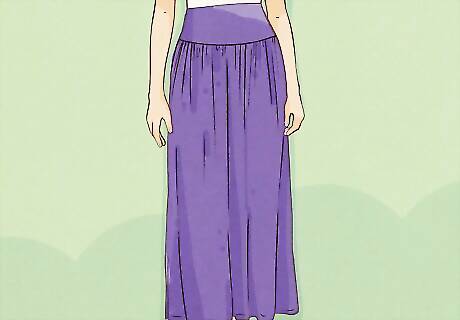 Go formal with a ball skirt. It is long like a maxi, but much more voluminous. Ball skirts are often made from fancier materials, such as taffeta. Like the name suggests, they are great for formal occasions, including galas. Alternatively, you can tone it down with a casual denim top. For a dressier look, pair a dark-colored ball skirt with a fitted blouse. Finish the look off with nice pumps or heels and matching jewelry. For a casual look, try a light-colored patterned ball skirt with a button-up blouse. A knotted, denim blouse will help keep things looking even more casual.