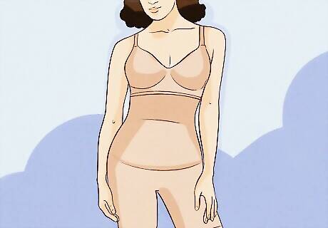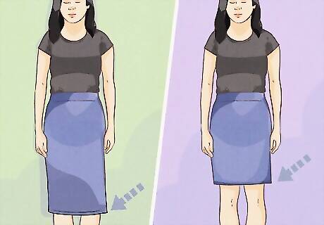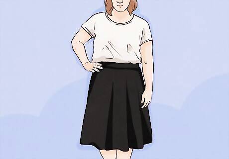 Streamline your silhouette with heavier fabrics and flared skirts. Flared skirts are anything that is fitted at the waist, and flares out past the hips. Great examples include the A-line skirt and the fit-and-flare skirt. Something made from a heavier fabric, such as denim, leather, or linen, will help tuck in muffin tops and full tummies. If you need a more drastic change, try a body shaper made from strong, sturdy spandex. Full circle skirts, mid-rise skirts, and skirts with wider waistbands may also help.