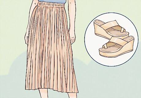 Wear midi skirts with care. Midi skirts end at the mid calf. This means that they can make your legs look shorter, wider, or stumpier than they actually are. If possible, choose a midi with a high waist. This will help elongate your lower half. Make midi skirts more flattering with a pair of heels. This includes booties, pumps, and wedges. If you have short legs, consider buying a midi skirt in a petite size. It will have a specific cut that flatters your figure. For a classic look, pair a midi skirt with a fitted blouse, matching booties, and a long necklace.