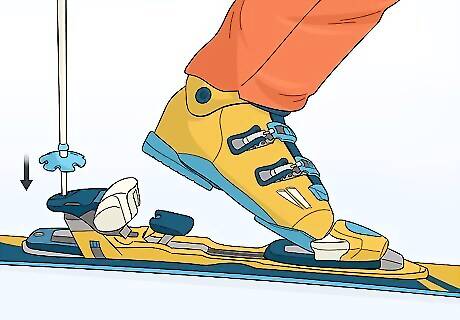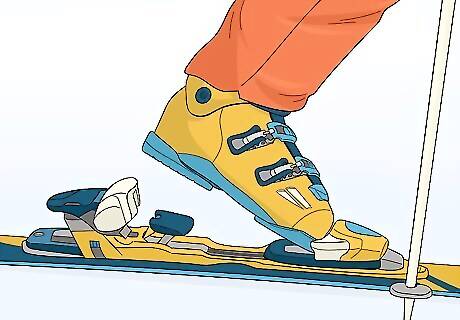 Put on the first ski. Put your poles on the side of each ski and hold onto them for balance. Then, tilt your foot forward and stick the extension of your boot into the front of your skis’ clip. It should fit perfectly. Afterward, push the back of your foot down onto the clip and you should hear a “click” sound. Try lifting your foot to see if your skis are attached. If you don’t hear a click when you put your foot in, try again until you do. Repeat with your other ski.