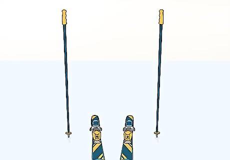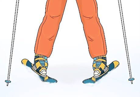 Position your skis so they form a slight “V”. Stand parallel to a slope if needed, as it's preferable to take off your skis on a flat surface. Adopting a slight snow-plow position gives you more balance when you take off your ski. Hold each pole in your hand.