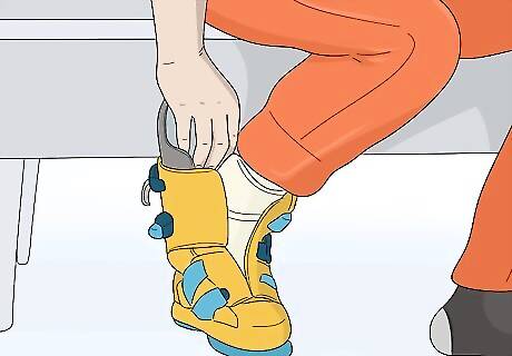 Put on your ski boots. This can be hard if this is your first time, so be careful. First, undo all the fastening and flip the flap down so you can easily step your foot in. Slide your foot smoothly into the boot. Start by wiggling your toes inside, and then step down hard on your heel. It will be tight when you put your foot in, as a ski boot’s top is usually quite hard and tight. If you are having difficulties, consider stretching the sides of your boot and then put your foot in.