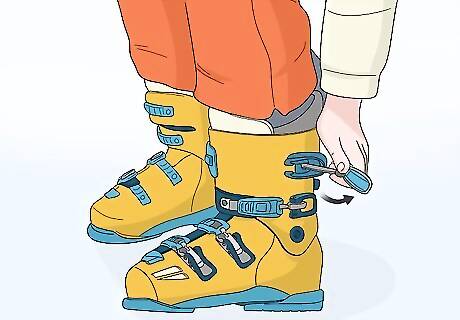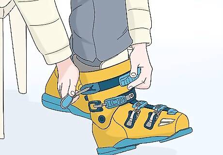 Tighten your boots. It is very important to tighten your boots. If you don’t size it correctly, it will be very difficult to ski, since you won’t have much control if your boots are too loose. Locate the clips on top of your boot. Usually, they have around four clips, but that depends on the size of your boots. Then, push the latch on each clip and push it so it clips onto the clip. Do not clip it on to your desired tightness all at once, since it will be very difficult, and the size will be very different. It can also hurt your boots if you do. This means that if you want to clip it onto the 4th latch, first clip onto the first one, and then move onto the second, then the third, and so on. Your foot should be a little tight in your boot, which is normal, but make sure it’s not too tight. If the boot is tight, it will give you more control of where you are going when you ski. If it's too tight, you'll start to get blisters if you ski for a long time. It's okay to have your boots on different levels tightness on either foot; most people have one foot a little bigger than the other, so you might be comfortable with your boots at adjusted per foot. Try walking, if you have to. Put your balance forward and attempt to walk. Try a "heel-toe" walk; consciously put down your heel, then your toe. If your boots are too tight or very uncomfortable, resize it or request a new one. It will be challenging to walk on ski boots for the first time, so be careful and walk slowly.Warning! Clip your boots onto each latch one by one. If you don’t, the tightness will vary every time, and it will be almost impossible to clip it on.