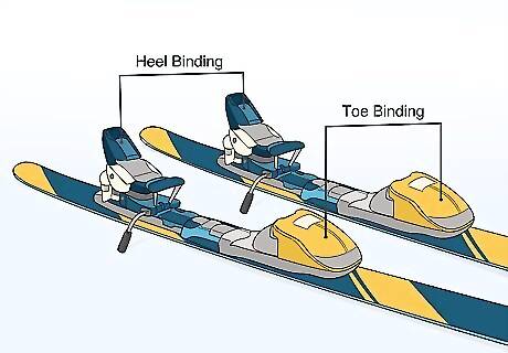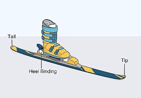 Know the "anatomy" of your skis and boots. Skis have a curved point at the front and a blunt flat rear end. The binding, where the boot attaches to the ski, are roughly in the middle, and there's either one or two, depending on whether you're downhill skiing, cross country skiing, or doing another activity.