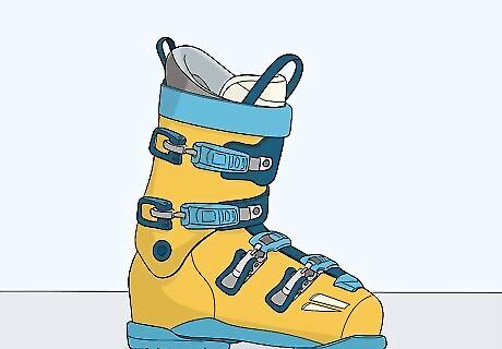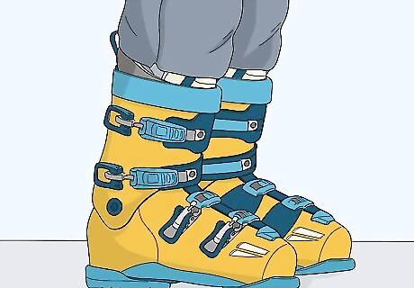 Wear the right ski boots. If you own your own boots, make sure they still fit correctly before you try them with skis. If you're hiring boots to ski, measure your foot size as ski boots don't always correspond with regular shoe sizes. Ask an attendant to find you a pair of boots in your size. To ski, you need special boots that attach to the bindings on to the skis. The size of your boots is very important for comfort and safety when skiing. Make sure your boots feel comfortable and don't pinch or rub.