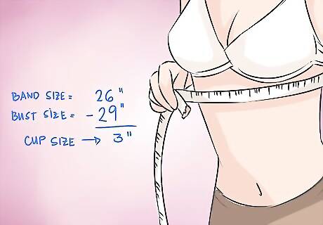 Take the difference between your band size and your bust size to find your cup size. Add a cup size for every inch (2.5cm). For example, a difference of one inch (2.5cm) puts you in an A cup, a difference of two inches (5cm) puts you in a B cup, a difference of three inches (7.5cm) puts you in a C cup, a difference of four inches (10cm) puts you in a D cup, and a difference of five inches (12.5cm) puts you in a DD or E cup. If the difference is less than one inch (2.5cm), you should wear an AA cup.