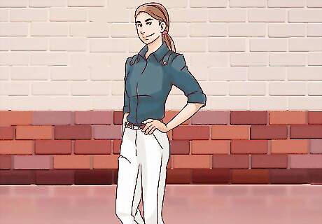 Pair white fitted pants with a loose, a white button-up blouse, and gold accessories. Tuck the blouse into waistband of the pants. For the shoes, try something with heels, in either black or nude. This will give you a sleek, chick look perfect for any weather.