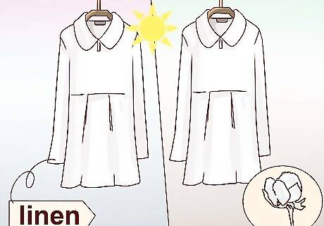 Choose linens and cottons during the warmer months, especially summer. Summer is the perfect time to break out your favorite white pants, skirts, and dresses. The bright sun will give your skin that perfect glow, and it will help make your white clothes sparkle even more. You can even try a white cotton or linen blazer during the summer. Try something loose and flowing in the summer, such as peasant blouses or maxi dresses. If you'd like a more streamlined look, wear a wide belt around your waist to cinch in the excess fabric.
