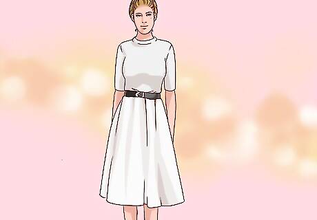Pair a full, white midi skirt with a skinny belt and a grey or black blouse. For the shirt, you could try a black tank top, or a loose-fitting, grey blouse. For a special night out, try the shirt in a different material than the skirt, such as silk.