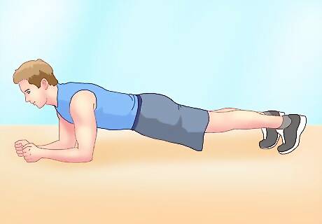 Do the plank. This is a great exercise that will work your entire core and back. Planks engage all your abdominal muscles and are especially good at targeting your obliques. Use the following instructions to make sure you are planking properly: Lay down flat on your stomach with your legs extended and your feet together. Lift your body into a push-up position while resting on your forearms and the tips of your toes. Keep your elbows aligned underneath your shoulders. Keep your back straight so that your body forms a straight line from your neck to your heels. Hold this position for as long as you can, then take a short rest before repeating. You should feel all your core muscles being engaged. Add a variation of this move by bringing one knee at a time toward your elbow while in the plank position. This variation helps to specifically target your obliques. Repeat four times, increasing the length of time you remain lifted as you grow stronger.