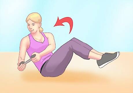 Do Russian twists. This ab exercise is performed in a seated position and targets all your abdominal muscles — but only if you pull your stomach muscles inward. There are numerous variations you can perform to place more emphasis on certain muscle groups. The exercise is described below: Sit on the floor with knees bent at a 90 degree angle in front of you. Recline your back towards the floor behind you until you feel your abdominal muscles engage. You should be contracting your abs and pulling them inward the whole time in order to keep your back off the ground and to engage the transverse abdominals. Be vigilant about keeping the abs pulled in. If you catch your tummy bulging out, that is your rectus abdominus taking over the job. Re-position pulling the abdominal area inwards towards your spine. Clasp your hands together in front of your chest. While keeping your knees stable and pointed toward the ceiling, rotate your hands slowly from side to side. You want your hands to touch the floor beside you with each twist. Aim for right beside and slightly behind your hips. Twist the other direction and repeat until you can't hold the position any longer. To increase the intensity of this exercise, straighten your knees and lift your feet off the floor a few inches while you twist your torso. You can hold a small dumbbell or medicine ball in your hands for added difficulty. Remember to perform this exercise slowly and in a controlled manner. This is a fairly advanced exercise and will work your obliques, but it is risky on the lumbar region of your back. If you are out of shape or have back issues, you may want to skip this one.