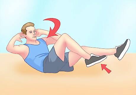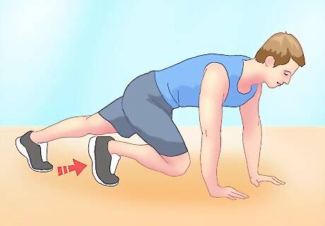 Include mountain climbers. This exercise, unlike most of these, combines cardio and strength training. As such, it is best performed at a fast pace in order to elevate your heart rate. Mountain climbers work all the muscles in your abdomen and also require no equipment. See these instructions for proper form: Start by getting into a plank or push-up position. Keep your back straight, toes on the floor, and arms extended with palms on the floor about shoulder width apart. Bring one knee up toward your chest as far up as you can and tap your foot on the ground underneath you before extending your leg back to its starting position. Immediately repeat this move with your other leg and keep going until you can't keep up your pace anymore. This exercise should be performed rapidly so that your abdominals are continuously contracted.