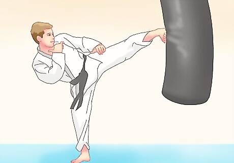 Try martial arts. Some forms of martial arts, such as kickboxing and krav maga, are high-intensity and incorporate cardio into their training routines. You can find martial arts studios with classes designed for all ages in just about any city of at least moderate size. If you don't have the luxury of taking a class, find tutorials and workouts online and do them at home on your own. Many of the moves required in martial arts routines require frequent engagement of the abdominal and oblique muscles, so these can be great ways to get rid of love handles. Martial arts classes offer a great all-in-one workout by combining high intensity cardio with abdominal strength training, so give this option extra consideration if you have a packed schedule and cannot devote time to both types of exercise.