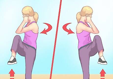 Try twisting knee raises. This exercise works your legs and abdominal muscles simultaneously. The twisting motion of this exercise is especially good for targeting your obliques. Check out the instructions below for how to do these: Stand with your feet shoulder-width apart and your hands behind your back — this is your starting position. Remain in a standing position and lift your left knee up toward your chest as high as you can, using only your abdominal muscles to hold this position. At the same time, twist your torso to bring your right shoulder across toward your knee. Clench your abs while twisting and keep them contracted while you hold the position for a few seconds. Lower your raised foot back to the floor and straighten your torso. Repeat the exercise on the other side and continue doing this for a total of 30 seconds or until you can no longer hold the flexed position. To increase intensity, you can focus on keeping your movements slow, smooth, and controlled. You can also try holding the flexed position for a bit longer.