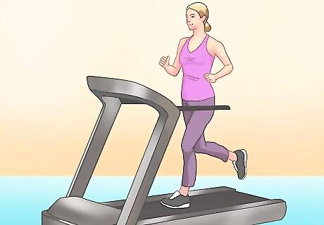 Aim for 2.5 hours per week. Although cardio doesn't specifically tone your abdominal muscles, it is a great way to burn calories and lose body fat. Your abs can be super toned but you can still have love handles if there is body fat around your hips, so cardio is essential for losing love handles. In order to get the most out of your cardio routine, keep up with it by splitting your 2.5 hours into sessions of about 30 minutes. By removing fat from your oblique/abdominal areas, you will reveal the muscles underneath. Aim for moderate intensity activities (or reduce your workout time for higher intensity). These kinds of activities keep your heart rate elevated for sustained periods of time. You should be somewhat out of breath, breaking a sweat, and only able to speak short sentences between breaths. Moderate intensity means your heart rate should hover around 60 to 70% of its maximum (which you can estimate by subtracting your age from 220). Traditional, moderate-intensity cardio workouts involve running/jogging, brisk walking, using an elliptical machine, swimming, spinning/cycling, rowing, etc. Choose whatever is most appealing or easiest for you and get moving! Be sure to drink plenty of water before and during your cardio workouts. Becoming dehydrated while doing cardio is both unpleasant and dangerous.