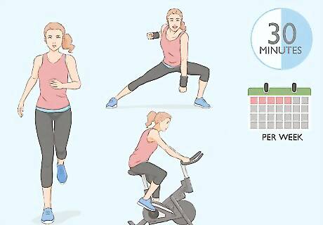 Aim for 150 minutes of cardio exercises per week. Even though you're aiming to keep your workouts on the quieter side, still aim for the required 150 minutes of cardiovascular exercises each week. Even quiet aerobic exercises still provide a vast array of health benefits. These types of exercises work your heart and lungs and can help reduce the risk of high blood pressure and diabetes, improve your mood, help maintain a healthy weight and reduce your risk for developing heart disease. 150 minutes or about 2 1/2 hours is the minimum you need to do each week. You can split this up into small bouts. For example, a 10 minute workout or walk 3 times a day Monday through Friday will help you reach this goal. Choose quieter activities like: using the elliptical, walking on the treadmill, using a spin bike or walking DVD's. Also consider asking your neighbors or roommates when a good time for you to do louder exercises would be. You can do a plyometrics routine or longer run on the treadmill if no one is around.