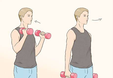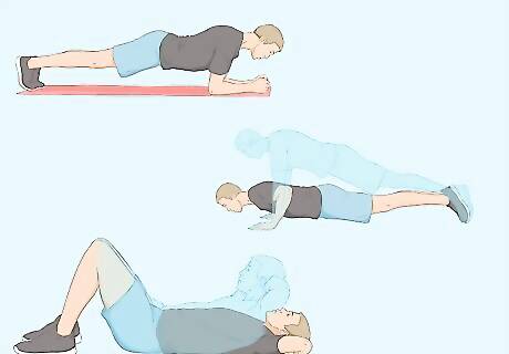 Go for free weights and calisthenics. Another option for strength training is using free weights or calisthenics. As long as you control how you're doing these exercises (especially free weights), its much quieter than using a home gym or weight machines. When using free weights, make sure you set them down quietly, instead of dropping them on the floor. Otherwise, these are incredibly quiet and won't disturb neighbors or others at the gym. Calisthenics are exercises that use your own body weight for resistance (often known as body weight exercises). They require little to no equipment and are very, very quiet. Examples of strengthening exercises you can do include: push-ups, crunches, planks, tricep push-ups and squats.