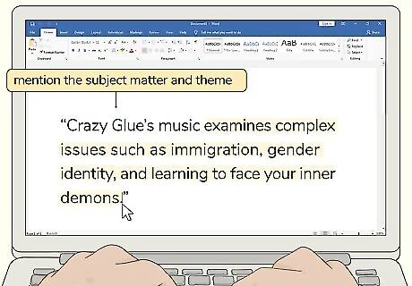 Communicate the subject matter and themes you tackle in your music. This is especially important if your music is political or your lyrics are essential to the personality of your music. Give the reader a little insight into the subject matter and content of the music to draw them in even further. Spend 2-4 sentences on the content of your music. For example, you may say, “Crazy Glue’s music examines complex issues such as immigration, gender identity, and learning to face your inner demons” or, “On Fishing for Pennies, Crazy Glue creates a complex narrative about a lost boy looking for his home in the world.”