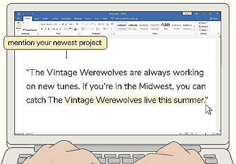 Mention your newest project to let people know what you’re up to right now. Finish the bio by including what your band is currently doing. If you’re working on an album, describe when it will come out or what it will be about. If you’re preparing to go on tour, mention date and region. Include your band’s website at the end if you have one. Whenever your band starts working on a new album or goes out on a big tour, update your bios to let newer fans know what you’re doing. For example, you may say, “The Vintage Werewolves are currently working on their next album, Digging Deep. It will be released in the winter of 2020. To learn more and keep up with the band, visit us online at VWmusic.com.” Alternatively, you may write, “The Vintage Werewolves are always working on new tunes. If you’re in the Midwest, you can catch The Vintage Werewolves live this summer.”