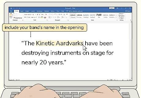 Include your band’s name in the opening sentence of the bio. Unless there’s something really unique about your band, start off the bio by introducing your band’s name. This will let reader’s immediately know who they’re reading about. The band name can either go directly at the front of the first sentence, or be prefaced with a little note about where you’re from or when your band was first formed.Tip: Lead by describing the genre of music you play if it’s really unique. For example, if your band makes traditional Irish music, lead by explaining where traditional Irish music comes from and what it sounds like so that the rest of the bio makes sense. Most of the time, your band’s name, genre, and basic information goes in a single sentence at the beginning of the bio. You can mix this up if you’re shooting for something a little different, though. For example, you might start, “The Kinetic Aardvarks are a ska band from…” or, “Formed in 1999, the Kinetic Aardvarks are a Montreal-based band…” For the playful bio, you might say, “The Kinetic Aardvarks have been destroying instruments on stage for nearly 20 years.”