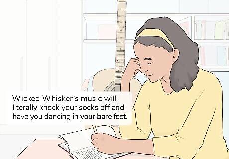 Explain what the audience will experience when they listen to you. After you’ve introduced your band, it’s best to describe the music itself. Since a band’s main product is its music, it’s essential that the reader gets a sense for what your sound actually is. You can do this by describing the sound in a vacuum, or by focusing on different projects. Depending on the length of the bio you’re making, spend 3-6 sentences describing your band’s music. For example, you may write “Wicked Whisker’s music is dynamic, spacey, and overwhelming. From the thumping 808s to the unique synth lines, each song will leave you coming back for more. Often aggressive and always chaotic, Wicked Whisker knows how to develop a tempo that keeps the audience on their toes.” For a more playful example, you may say something like, “Wicked Whisker’s music will literally knock your socks off and have you dancing in your bare feet.”