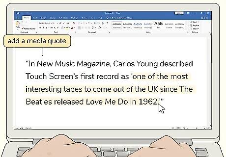 Add a media quote if your music has been professionally reviewed. If your band is well-established and you’ve been written about before, consider spending 1-2 sentences quoting an essay about your music. Either work this information in before you describe the music, or before you tell readers what you’re currently doing.Variation: If you have a really great quote, consider starting the bio with it as a way to introduce your band. Some bands do this to establish that they’re well-respected by critics right at the beginning. For example, you may start, “Sally Young describes Turtleneck Outbreak as ‘the best band you’ve never heard of.’” For example, you might write, “In New Music Magazine, Carlos Young described Touch Screen’s first record as ‘one of the most interesting tapes to come out of the UK since The Beatles released Love Me Do in 1962.’” If you don’t have any media quotes, contact smaller papers and blogs to see if they’d be willing to write about you!