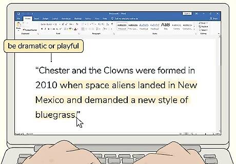 Be dramatic or playful to stand out in the bio designed for fans. Use the bio on your website, CD inserts, flyers, and advertisements to reflect the way your music sounds. The structure of this bio is identical to the straightforward bio, except you communicate your band’s style and personality through the language you use. Keep in mind, this style of bio should strictly be for the website or CD insert. Being a little ridiculous or playful is also a great way to attract potential fans since readers will be interested in hearing how your music sounds. Use this bio to reflect your band’s style and personality. For example, if you’re in a death metal band, shoot for an intense, dark tone. If you’re in a harmonica-heavy folk band, aim for a more lighthearted tone. A playful bio may include something like “Chester and the Clowns were formed in 2010 when space aliens landed in New Mexico and demanded a new style of bluegrass.”