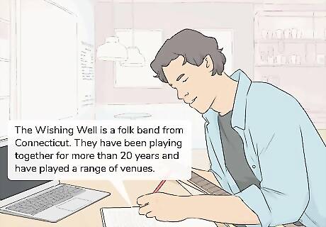 Stick with straightforward language in a standard bio for the press. How your bio looks and sounds depends entirely on what you’re using it for. Most bands use 2 bios: 1 simple bio for the press and promo materials, and 1 fun bio for their website and inserts. The structure of these bios are identical, but the simple biography should be to the point, accurate, and honest. Stay away from hyperbole and focus on composing compact and efficient sentences that convey as much information as possible. Use the straightforward bio for the press releases, Spotify bio, or promotional materials. Festivals will often request a simple bio for flyers and booklets as well. This bio is perfect for informative products like these. A straightforward bio may include sentences like, “The Wishing Well is a folk band from Connecticut. They have been playing together for more than 20 years and have played a range of venues.”