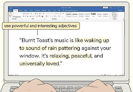 Use powerful and interesting adjectives that accurately embody your sound. Sound can be difficult to describe, so the adjectives you choose are key when it comes to helping the reader picture your music. You can mention the genre, the instruments, or the titles of records, but the adjectives are really the only way for listeners to picture the feeling your music creates.Tip: Replace words like “fun” with descriptors like “relaxed,” “celebratory,” or “pleasurable.” Change a word like “deep” to “dynamic,” “progressive,” or “complex.” Unless you’re trying to appeal to pre-teens, it’s best to avoid these basic terms. You can utilize metaphors as well. For example, you may write, “Burnt Toast’s music is like waking up to sound of rain pattering against your window. It’s relaxing, peaceful, and universally loved.” For example, instead of saying “Burnt Toast makes awesome folk music,” you may say “Burnt Toast’s sounds are magical, ethereal, and honest.”