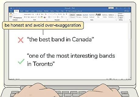 Be honest and avoid over-exaggeration unless it matches the tone. There’s a thin line between captivating your reader with descriptive language and misleading the reader with inaccurate hyperbole. Be specific and accurate when describing your band. Saying you’re “one of the most interesting bands in Toronto” is expressive, while saying you’re “the best band in Canada” is simply impossible to prove. This is obviously not true if you’re going with an over-the-top bio. In that case, you probably want to go the other direction by exaggerating as much as possible! Instead of saying, “The best band in Canada,” consider saying “The best band in the entire history of the universe.”