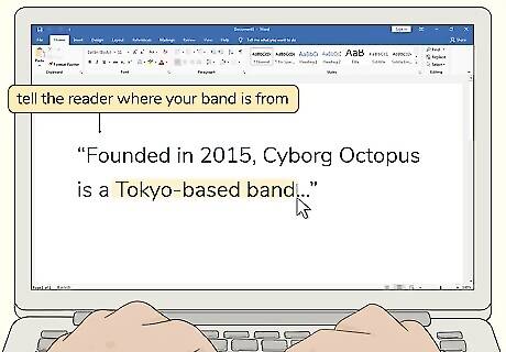 Tell the reader where your band is from and when you started playing. Put this introductory information in the first or second sentence. Mention the specific city your band is from if it’s well-known or you’re looking to build a local fan base. Otherwise, at least include the general region or country. If people are going out of their way to read your bio, they’re probably interested in where you’re from! For example, you might say, “Founded in 2015, Cyborg Octopus is a Tokyo-based band…” or, “Cyborg Octopus was formed in Tokyo. It was 2015 when they…” For the fun bio, you might say, “In 2015, the members of Cyborg Octopus emerged from the ground wielding guitars, drums, and violins like weapons.” Feel free to be a little ridiculous if your music is really unique or you’re trying to pique the reader’s interest.