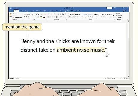 Mention the genre to let the reader know what you actually play. The genre can go in the first or second sentence. You can mention it in passing, or dedicate an entire sentence to it. Be accurate when describing the genre, regardless of the tone you’re shooting for, since it’s important for potential listeners to know what they’re getting into if they want to seek your music out. Unless your style of music is really common, don’t say “rock” or “hip hop.” Instead, say “upbeat, progressive rock,” or “Golden Era-style gangster rap.” For example you may say, “Jenny and the Knicks create operatic noise music…” or “Jenny and the Knicks are known for their distinct take on ambient noise music.” A full introduction may read like this: “Living in Paris, Jenny and the Knicks are a noise band that have been making expressive electronic music since 2018.”